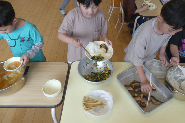 給食は自分たちで配膳しています。自分で盛り付けることで適量を知ったり食への興味と意欲を育てたりします。
