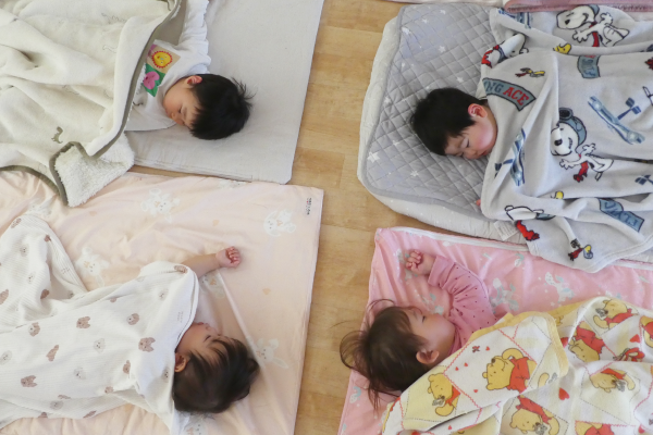 3,4,5歳児は30分おきにブレスチェックを行います。午睡中の体調の変化があった場合、すぐに対応できるように職員がそばで見守ります。